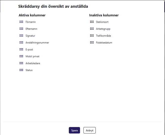 OlofFrom_7-1756283720874.pngSkräddarsy din personalvy. Välj vilka kolumner du vill ha aktiva och inaktivera de som inte är relevanta för er. Dra och släpp kolumner till/från höger och vänster för att välja. Spara när du är nöjd.