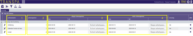2. Schemaperioder: Visar hur många veckor schemat roterar på. Om det står "2" innebär det ett 2-veckorsschema där veckorna skiljer sig åt. Står det "1" är schemat identiskt varje vecka.