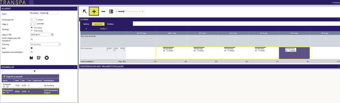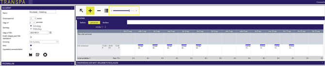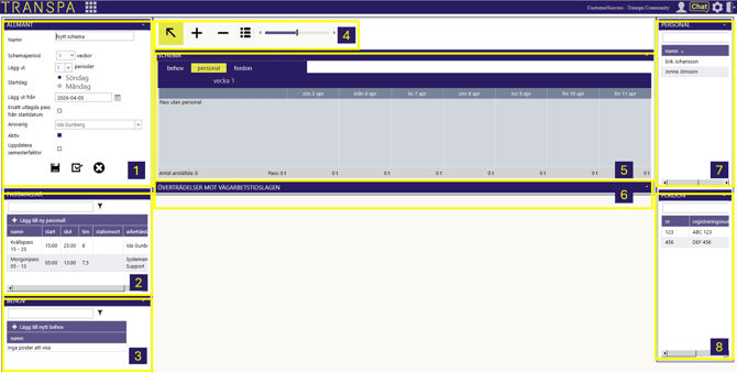 5. Planeringsfönstret: Här bygger du själva schemat. Du kan välja att arbeta utifrån tre olika flikar beroende på vad som passar dig bäst: Personal, Behov eller Fordon.