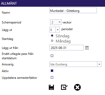 1. Grundinställningar: Här namnger du schemat och bestämmer dess längd. Om en anställd till exempel är ledig varannan fredag väljer du 2 veckor. Du ställer även in hur många perioder som ska läggas ut (t.ex. om ett 2-veckorsschema ska rullas ut 10 gånger blir det totalt 20 veckor i kalendern).