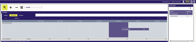 Nu öppnas schemaläggaren. Använd "drag-and-drop"-funktionen: Leta upp Erik i personallistan till höger, klicka på hans namn och dra in det i det stora schemafönstret.