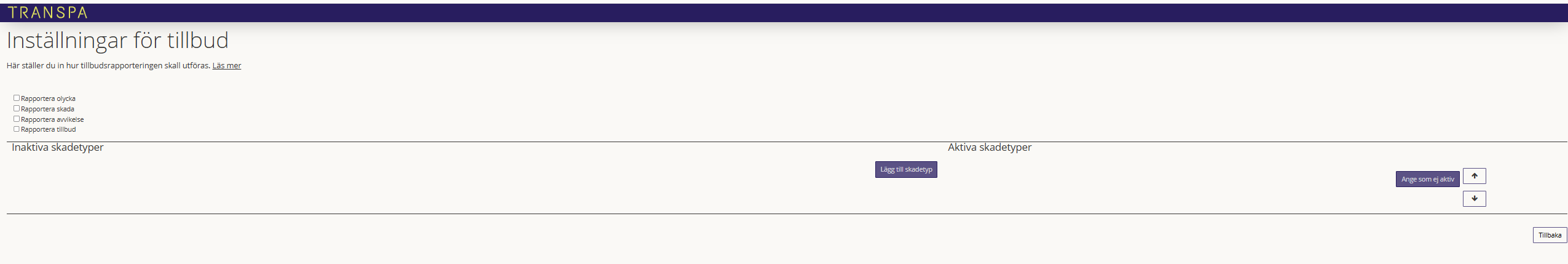 Välj först vilka typer av tillbud du vill få in rapporter då. Kryssa i Rapportera olycka/skada/olycka/tillbud. På rapporteringssidan visas endast de typer du har valt.