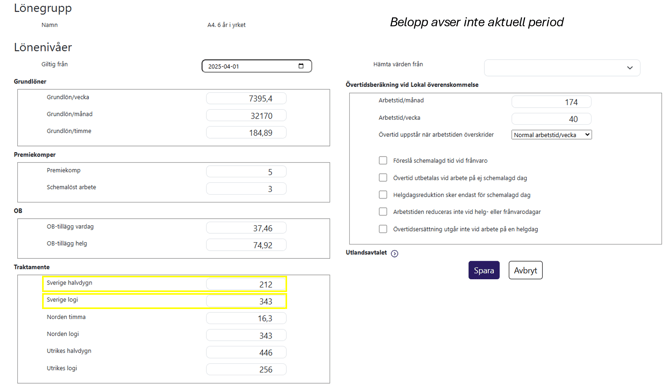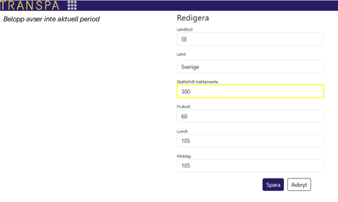 Alla aktuella belopp för traktamenten finns förinlagda i programmet från start. Dessa uppdateras automatiskt av oss så när nya avtalsperioder och belopp fastställs. Detta görs i standardlönegrupperna utifrån vissa kriterier som du kan läsa mer om här.