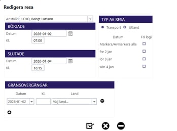 Reseberäkningen är helt skild från arbetstiden. Arbetspass rapporteras dag för dag som vanligt, medan resan registreras som en egen aktivitet först efter hemkomst. -