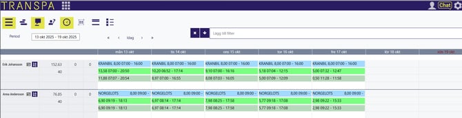 Till skillnad från er färdskrivarleverantör som visar sammanställning per dygn så visar Transpa istället färdskrivartider i jämförelse med pass och arbetstid.
