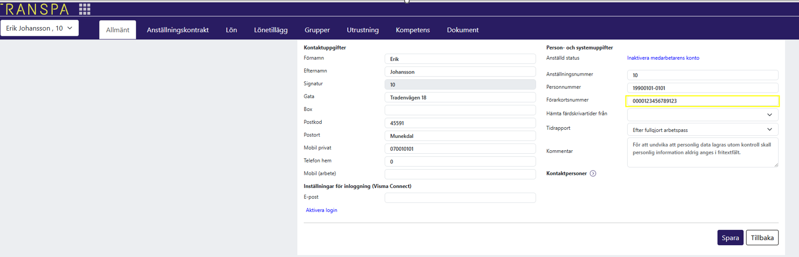 Från startsidan, välj personal och välj den anställde. Mata därefter in förarkortsnumret, 14 siffror. Välj spara.