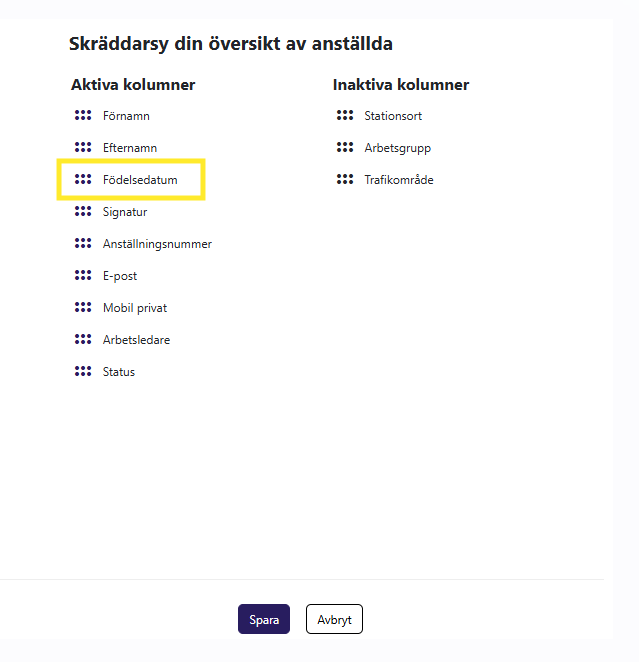 - Leta upp "Födelsedatum" och använd dra-och-släpp för att flytta kolumnen från höger (inaktiv) till vänster (aktiv).